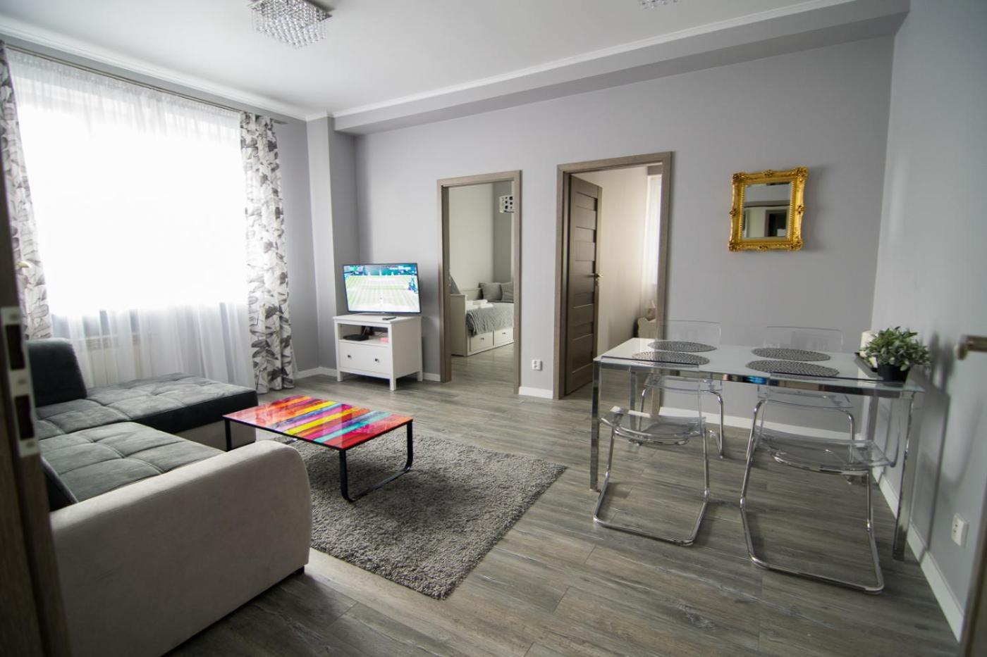 Apartament z 2 sypialniami. This spacious apartment consists of 1 living room, 2 separate bedrooms and 1 bathroom with a walk-in shower and free toiletries. The fully equipped kitchen features a stovetop, a refrigerator, kitchenware and a microwave. The apartment provides a flat-screen TV with streaming services, a washing machine, a private entrance, a coffee machine as well as city views. The unit offers 3 beds. Apartament - 6 osobowy. Powierzchnia pokoju ok.: 64 mkw.